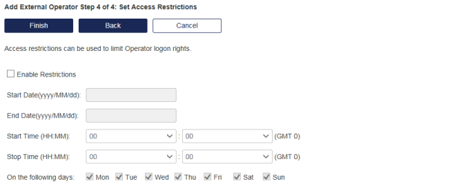 Enable Restrictions—If checked, restrictions are enabled. If cleared, no time, day, or date range restrictions are applied.
