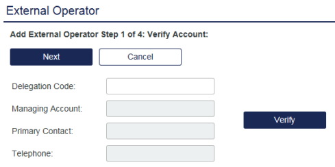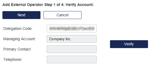 An external operator account can be created for each Service Provider to which management of the Virtual Server should be delegated. Each service provider account must provide a delegation code. This code will be used to create an external operator account for their exclusive use.
