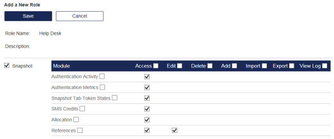 Access—Enables the role to access the module. To limit the role to read-only access, select Access and deselect Edit.