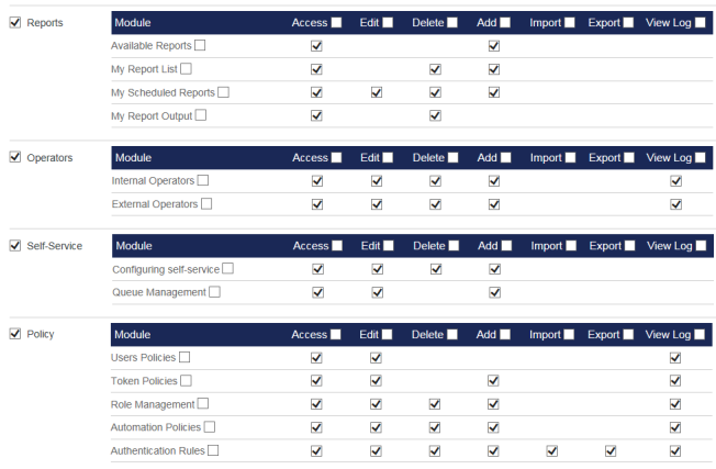 To remove a role's access to the Operator tab and all of its modules, deselect the Operators check box in the Operators section.