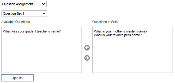 To add one or more questions to a set, select the set from the drop-down list, then using the arrows move the questions to be included in the set to the Questions in Sets list, then click the Update button to commit the change.