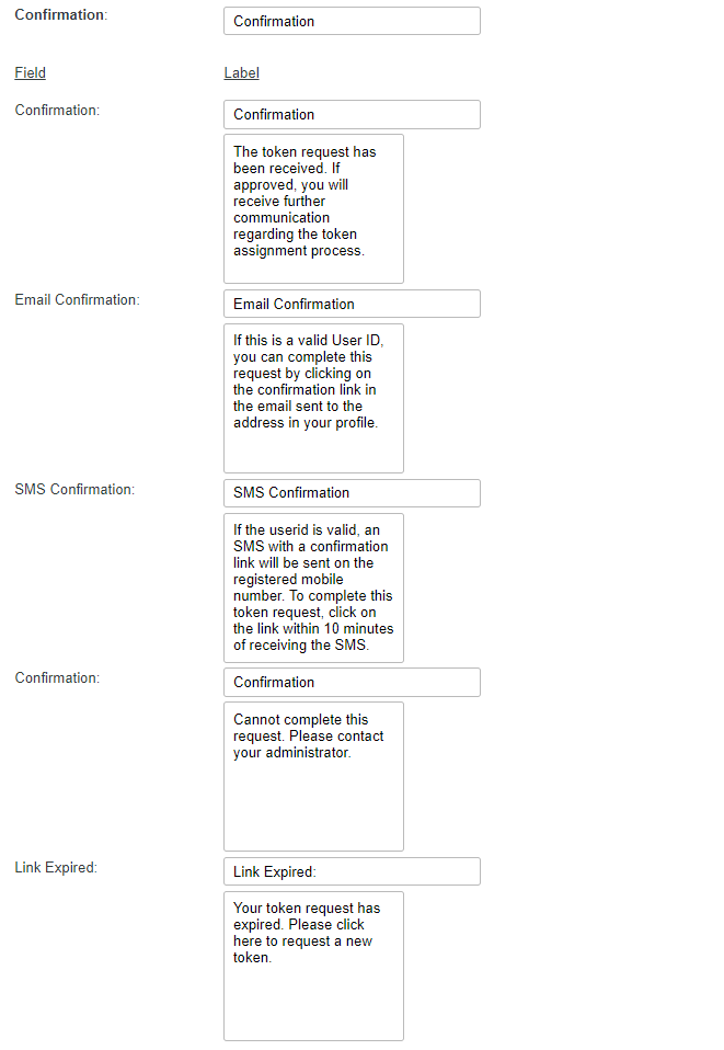 The Confirmation page is used to configure messages that are displayed to the user immediately following token selection.