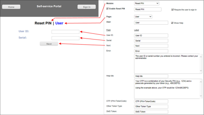 This service provides the ability for a user to reset the server-side PIN associated with a token assigned to them. There are five (5) pages in this service. Each page contains a section for error messages or help text.
