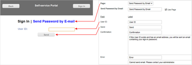 This selection sends a one-time password, valid only for the Self-Service site to the email address associated with the user ID. It includes error messages to handle cases where email cannot be sent or the user ID cannot be found.