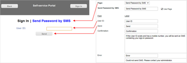 This selection sends a one-time password, valid only for the self-service site to the SMS number associated with the user ID. It includes error messages to handle cases where SMS cannot be sent or the user ID cannot be found.