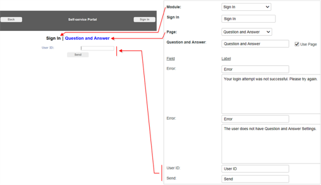 This service controls the options for signing into the self-service site. There are five (5) pages in this service. Each page contains a section for error messages or help text. The Sign In button is replaced with a Sign Out button when a user successfully authenticates to the Self-Service site.