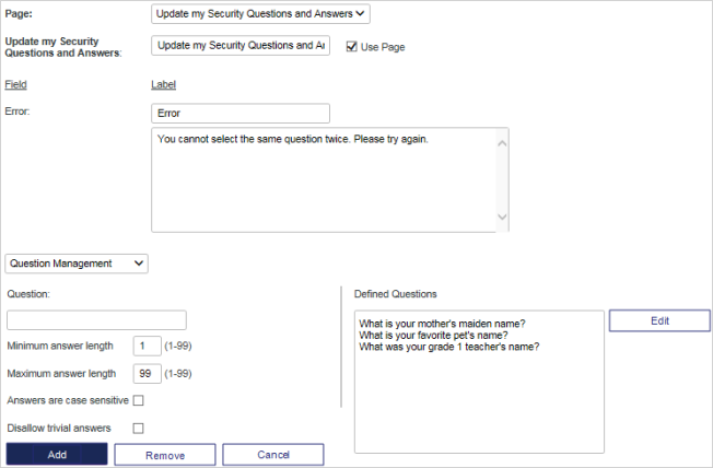 Use the Edit button to modify a highlighted question from the defined question list, including the minimum and maximum answer length, case sensitivity and trivial answer control options.