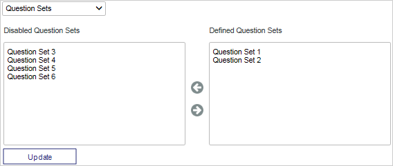 Use the arrows to add or remove question sets to or from the Defined Question Sets list. Sets in this list are displayed to the user.