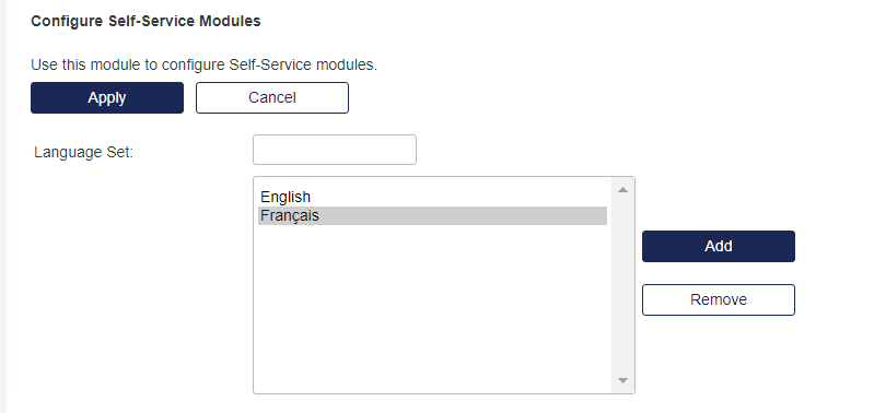 To add a language set, type the name for the set in the Language Set field, and then click Add. Next, modify all of the labels, default text, help text, and error messages for each of the pages in the service. For example, to create a French language set: