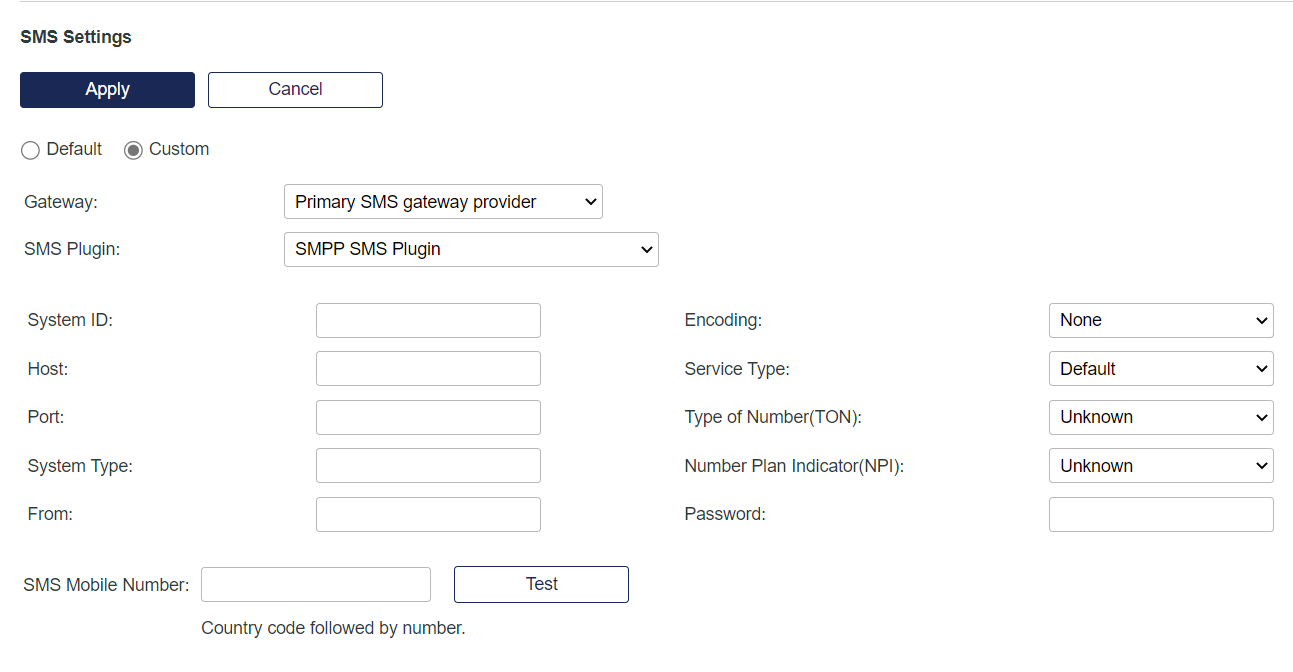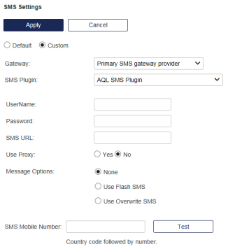 Custom—Select this option to configure the Virtual Server to send SMS messages via a gateway service to which you’ve subscribed or SMS modem installed at your site. You can verify the ability to send SMS messages by entering the number of a device capable of receiving SMS messages in the SMS Mobile Number field. SMS phone numbers must contain only digits and must begin with a country code.
