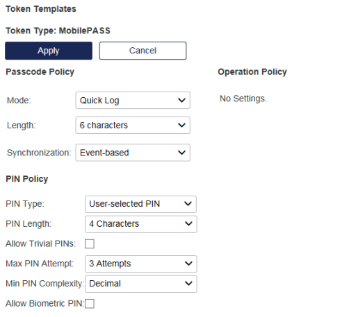 | Allow Biometric PIN | If enabled, Subscribers can use a fingerprint sensor or facial recognition instead of typing a PIN to access their MobilePASS+ token. Default value: Disabled. This option requires that: