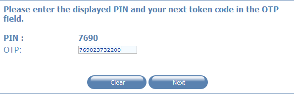 The next web page displays a temporary PIN and prompts you to enter an OTP. Your OTP is the combination of the displayed PIN and the token code generated by your KT-4.