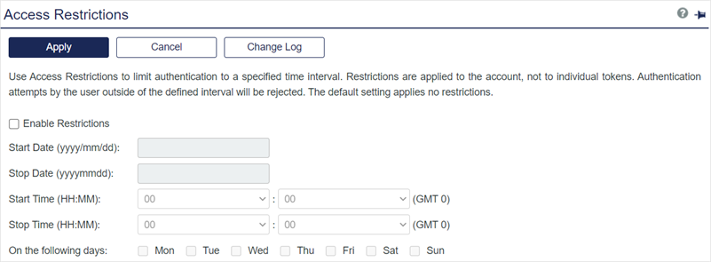 You can set time, day, or date restrictions on when a user can authenticate. By default, restrictions are disabled.
