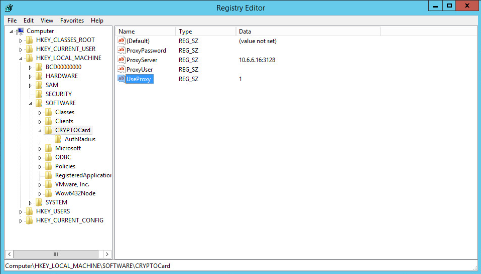 To support the use of a proxy server, create the following new registry keys at the location, HKEY_LOCAL_MACHINE\SOFTWARE\CRYPTOCard
