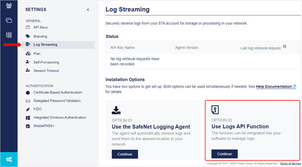 It also includes the two options for configuring log streaming: using SafeNet Logging Agent or the Logs API. The Logs API option takes you to the API Keys screen, where you can get an API key, and find the links to access the API and the API reference documentation.