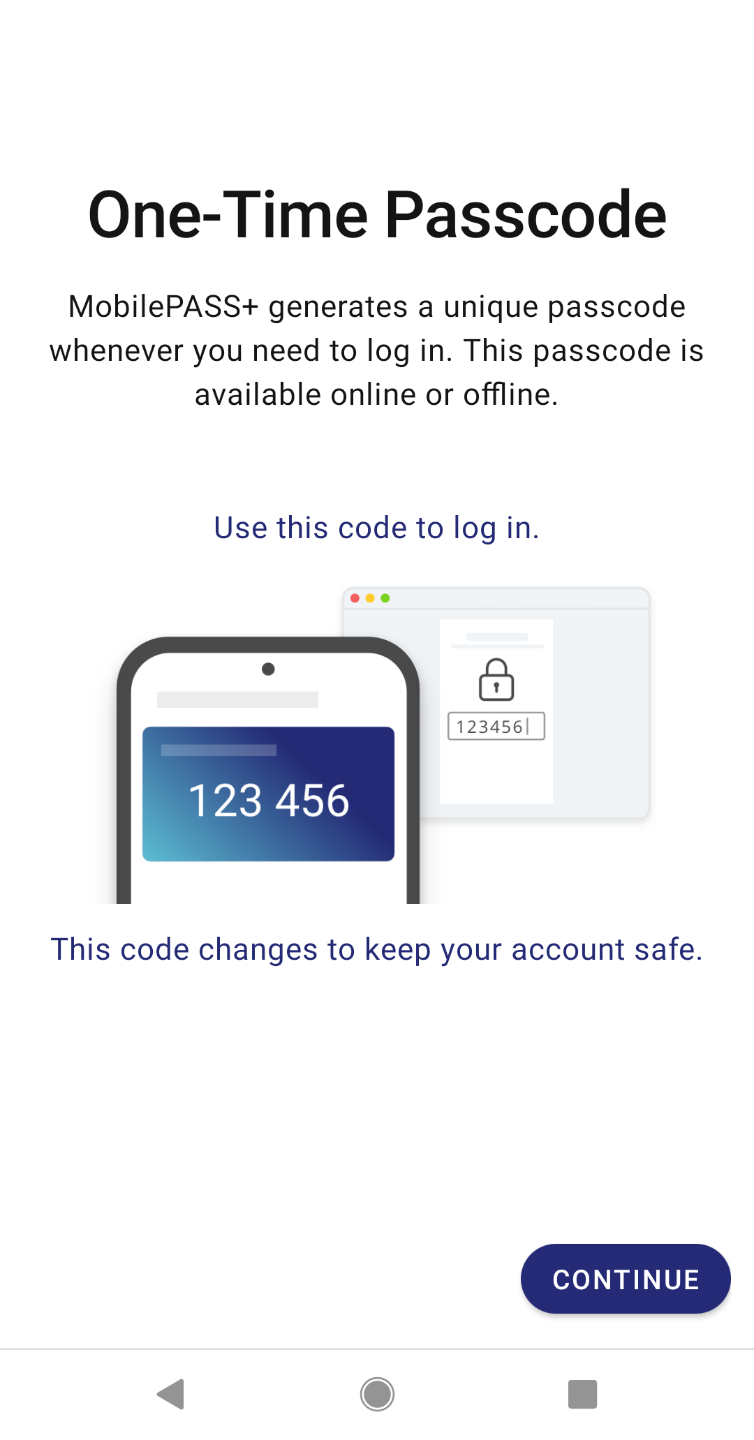 The SafeNet MobilePASS+ app guides you through the steps to set up and activate your authenticator.