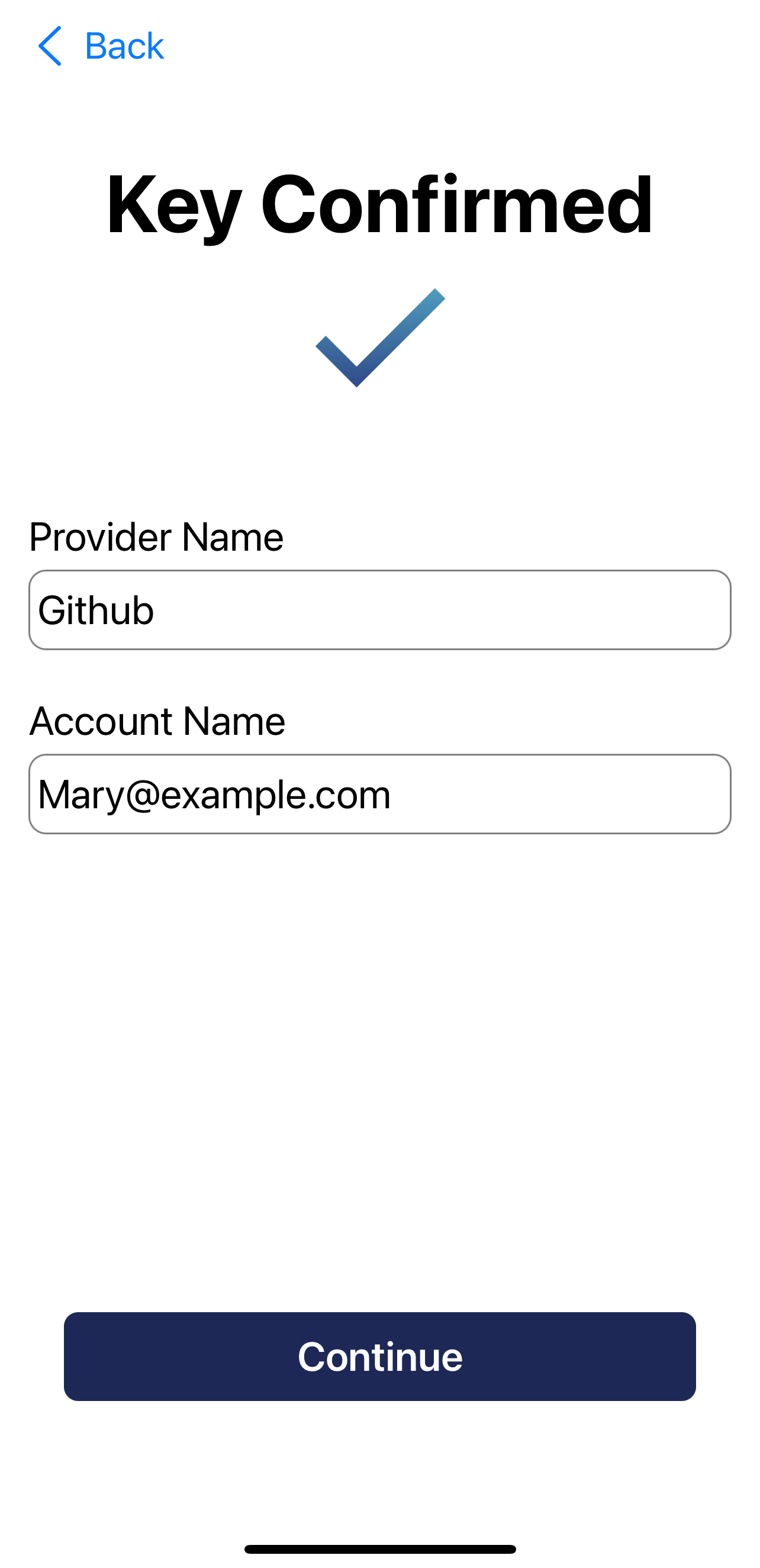 If you entered manually, the Key Confirmed page is blank. Enter the Provider Name and Account Name.