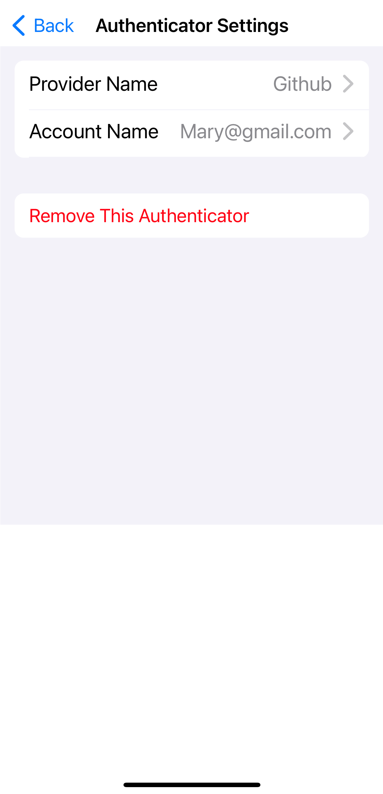 Third-party authenticators have fewer authenticator settings than MobilePASS+, consisting of the provider name, account name, and an option to remove the authenticator.