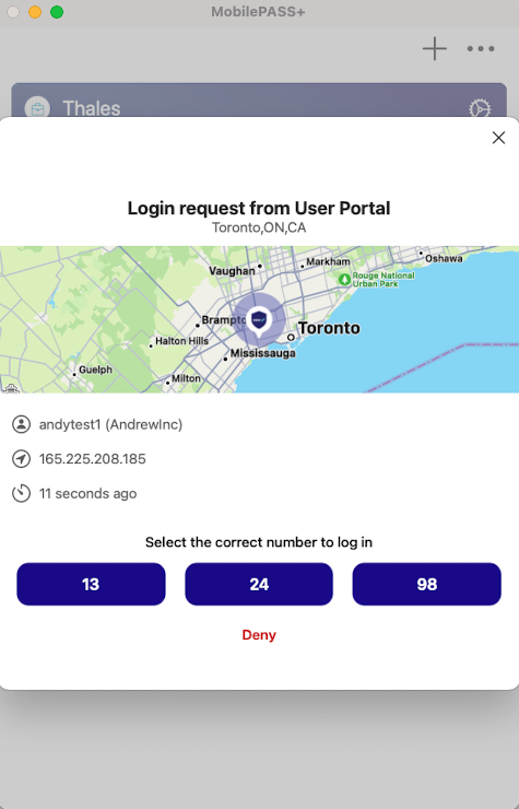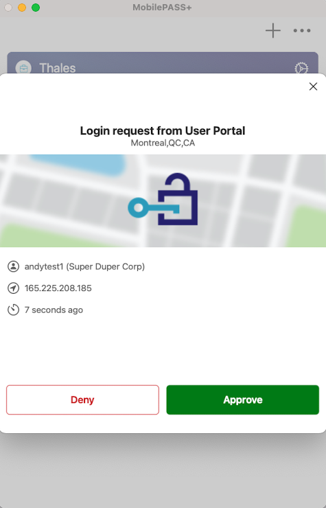 The login request window opens and displays information about the application that sent the request, including the location in the map, the name of the authenticator in SafeNet MobilePASS+, and the time elapsed since the request was received.