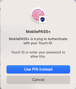 If your organization supports biometric PINs and you are using a Touch ID compatible device, the Touch ID window displays. You can use your Touch ID to authenticate. SafeNet MobilePASS+ sends a passcode to the login page.