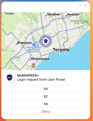 The login request includes information about the application that sent the request, such as the location in the map, the name of the authenticator in SafeNet MobilePASS+, and the time elapsed since the request was received.