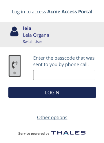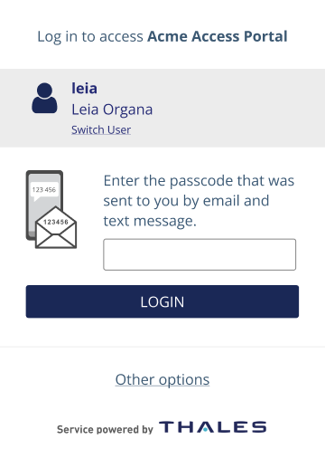If the user types any other character or leaves the passcode field empty, the OTP will be delivered by the default delivery method (if only one SMS token is assigned to the user).